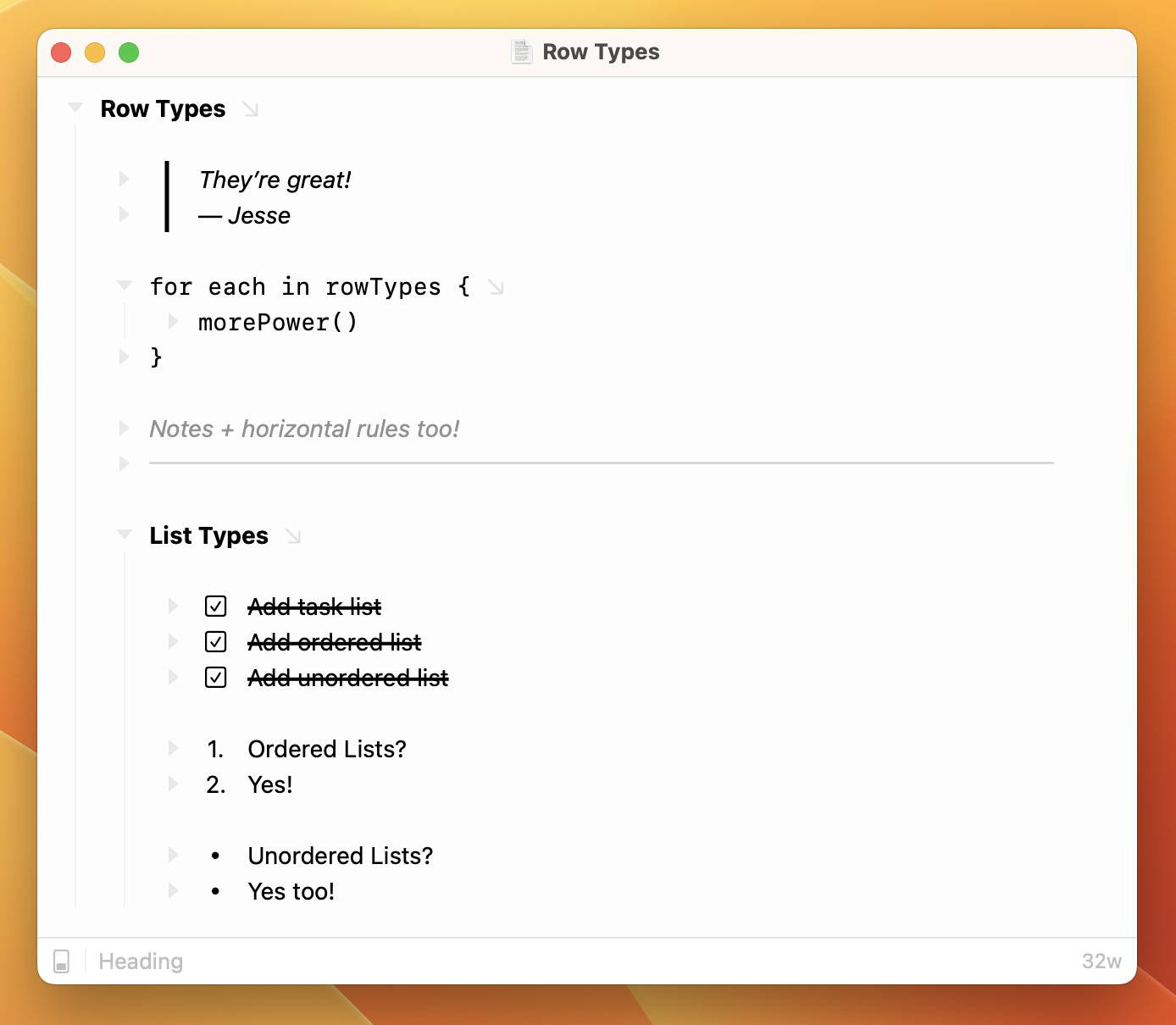 Use row types to add another level of structure and meaning to your outlines. Add heading rows, task list rows, ordered list rows, and more.